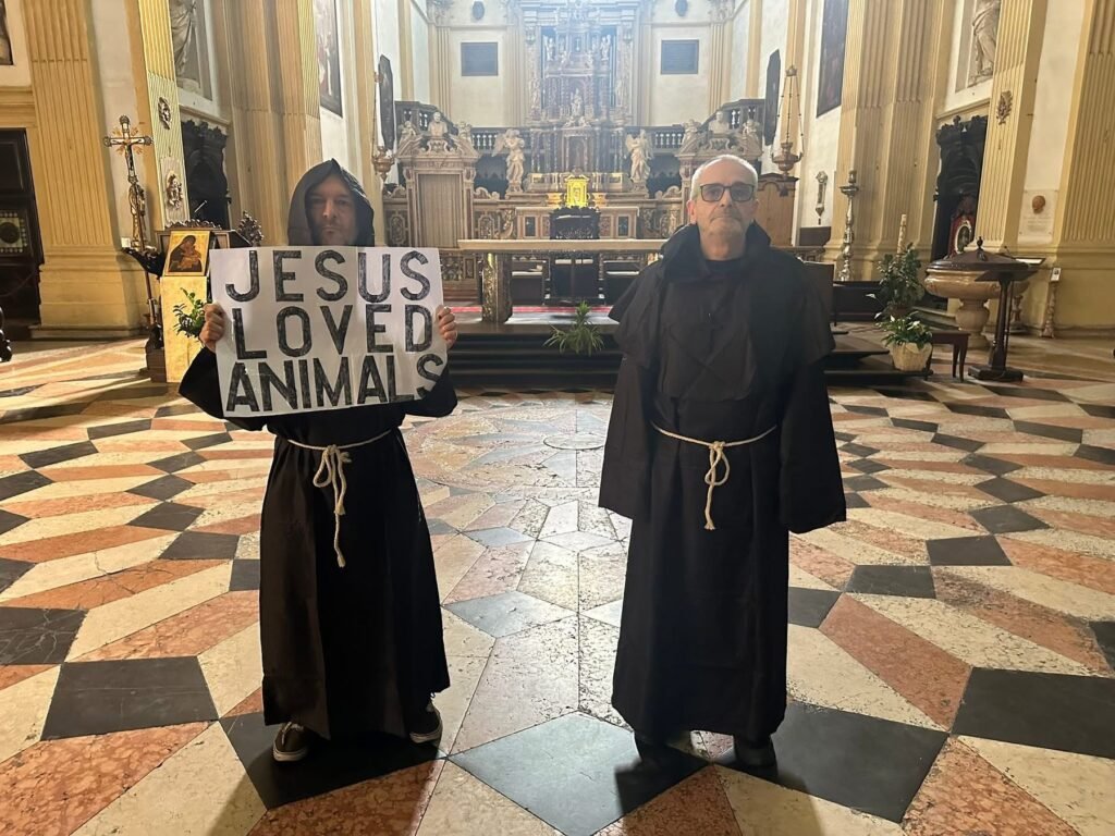 Dopo lo striscione appoggiato nel sagrato della chiesa alcune settimane fa, nel pieno pomeriggio di venerdì 3 ottobre, i nostri Militanti sono tornati in azione travestiti da frati e sono entrati nella chiesa di San Niccolò all’Arena, con un cartello in lingua inglese diretto ai turisti, con scritto: “Jesus loved Animals”.