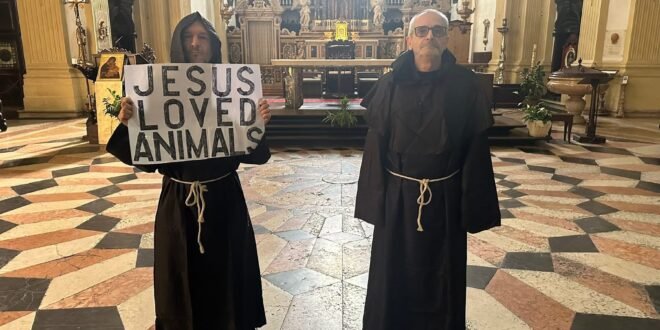 Dopo lo striscione appoggiato nel sagrato della chiesa alcune settimane fa, nel pieno pomeriggio di venerdì 3 ottobre, i nostri Militanti sono tornati in azione travestiti da frati e sono entrati nella chiesa di San Niccolò all’Arena, con un cartello in lingua inglese diretto ai turisti, con scritto: “Jesus loved Animals”.