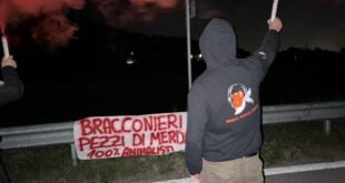 Fumogeni e uno striscione al Cataio di Battaglia Terme (Pd). In nostri Militanti, venerdì 3 ottobre in tarda serata, sono entrati in azione in zona dell’antica reggia dei Colli Euganei, per far capire ai bracconieri (cacciatori che non pagano la licenza) che la misura è colma. Ci siamo già occupati …